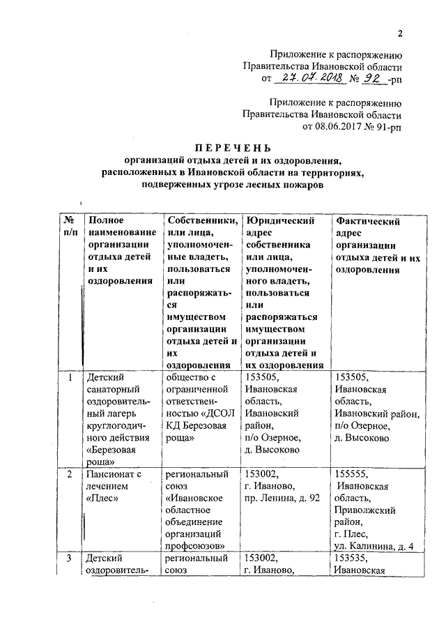 Распоряжение Правительства Ивановской области от 27.07.2018 N 92-рп "О внесении изменения в распоряжение Правительства Ивановской области от 08.06.2017 N 91-рп "Об утверждении перечня организаций отдыха детей и их оздоровления, расположенных в Ивановской области на территориях, подверженных угрозе лесных пожаров"