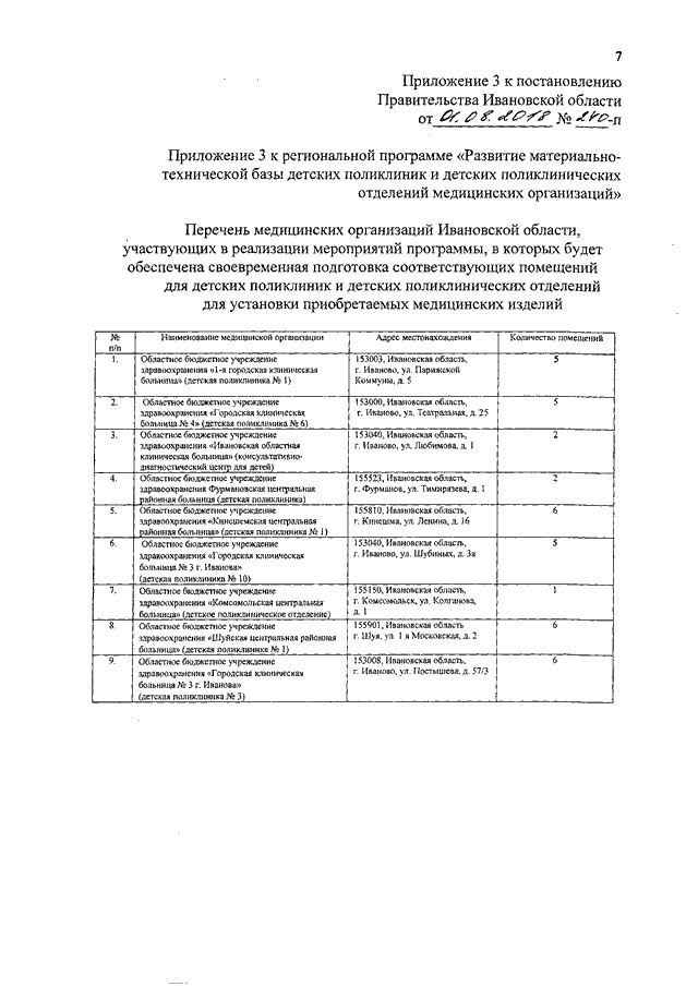 Постановление Правительства Ивановской области от 01.08.2018 N 240-п "О внесении изменений в постановление Правительства Ивановской области от 13.07.2018 N 200-п "Об утверждении региональной программы "Развитие материально-технической базы детских поликлиник и детских поликлинических отделений медицинских организаций" (вместе с "Перечнем медицинских организаций Ивановской области, участвующих в реализации мероприятий программы", "Перечнем медицинских изделий, планируемых к приобретению в рамках реализации программы", "Перечнем медицинских организаций Ивановской области, участвующих в реализации мероприятий программы, в которых будет обеспечена своевременная подготовка соответствующих помещений для детских поликлиник и детских поликлинических отделений для установки приобретаемых медицинских изделий", "Перечнем медицинских организаций, в которых будет обеспечена своевременная подготовка медицинских работников, имеющих соответствующий уровень образования и квалификации для работы с приобретаемыми медицинскими изделиями", "Примерным перечнем организационно-планировочных решений внутренних пространств детских поликлиник и детских поликлинических отделений медицинских организаций, рекомендованных к реализации в рамках программы")