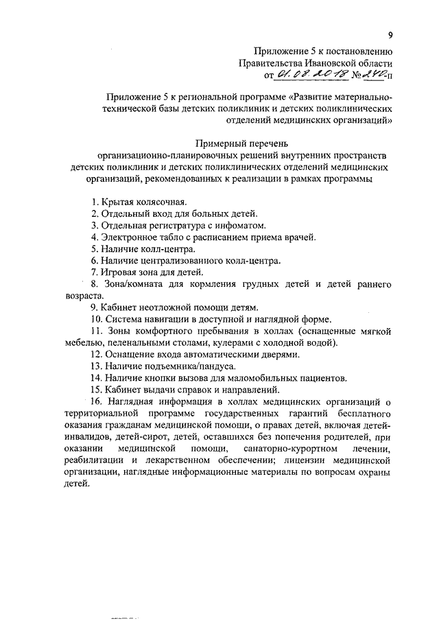 Постановление Правительства Ивановской области от 01.08.2018 N 240-п "О внесении изменений в постановление Правительства Ивановской области от 13.07.2018 N 200-п "Об утверждении региональной программы "Развитие материально-технической базы детских поликлиник и детских поликлинических отделений медицинских организаций" (вместе с "Перечнем медицинских организаций Ивановской области, участвующих в реализации мероприятий программы", "Перечнем медицинских изделий, планируемых к приобретению в рамках реализации программы", "Перечнем медицинских организаций Ивановской области, участвующих в реализации мероприятий программы, в которых будет обеспечена своевременная подготовка соответствующих помещений для детских поликлиник и детских поликлинических отделений для установки приобретаемых медицинских изделий", "Перечнем медицинских организаций, в которых будет обеспечена своевременная подготовка медицинских работников, имеющих соответствующий уровень образования и квалификации для работы с приобретаемыми медицинскими изделиями", "Примерным перечнем организационно-планировочных решений внутренних пространств детских поликлиник и детских поликлинических отделений медицинских организаций, рекомендованных к реализации в рамках программы")
