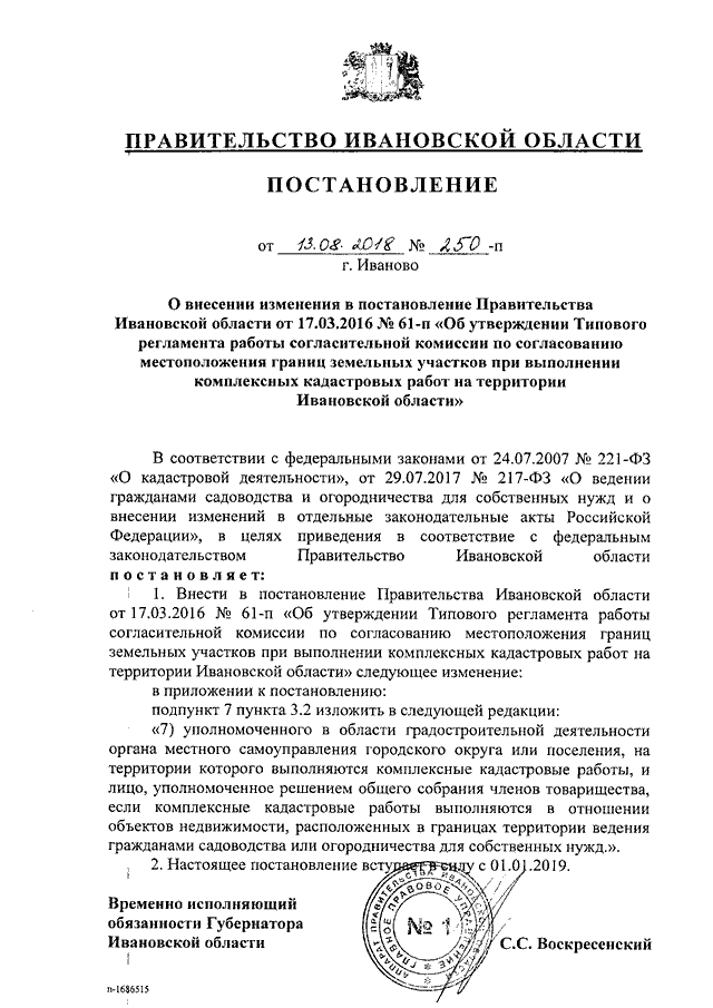 Постановление Правительства Ивановской области от 13.08.2018 N 250-п "О внесении изменения в постановление Правительства Ивановской области от 17.03.2016 N 61-п "Об утверждении Типового регламента работы согласительной комиссии по согласованию местоположения границ земельных участков при выполнении комплексных кадастровых работ на территории Ивановской области"