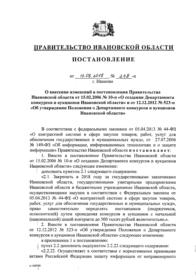 Постановление Правительства Ивановской области от 13.08.2018 N 248-п "О внесении изменений в постановления Правительства Ивановской области от 15.02.2006 N 10-п "О создании Департамента конкурсов и аукционов Ивановской области" и от 12.12.2012 N 523-п "Об утверждении Положения о Департаменте конкурсов и аукционов Ивановской области"