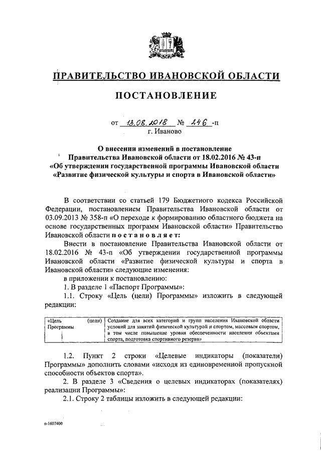 Постановление Правительства Ивановской области от 13.08.2018 N 246-п "О внесении изменений в постановление Правительства Ивановской области от 18.02.2016 N 43-п "Об утверждении государственной программы Ивановской области "Развитие физической культуры и спорта в Ивановской области"