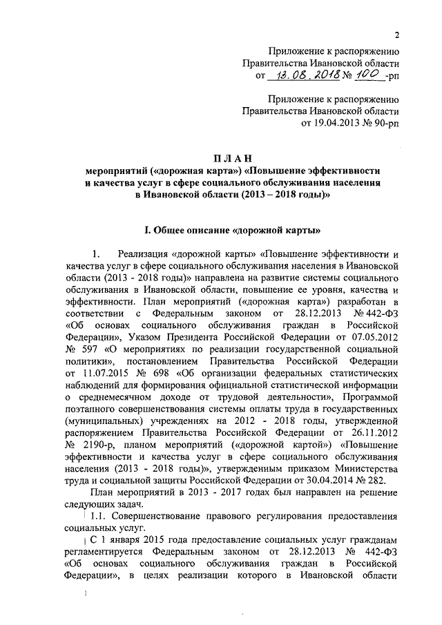 Распоряжение Правительства Ивановской области от 13.08.2018 N 100-рп "О внесении изменений в распоряжение Правительства Ивановской области от 19.04.2013 N 90-рп "Об утверждении плана мероприятий ("дорожной карты") "Повышение эффективности и качества услуг в сфере социального обслуживания населения в Ивановской области (2013 - 2018 годы)"
