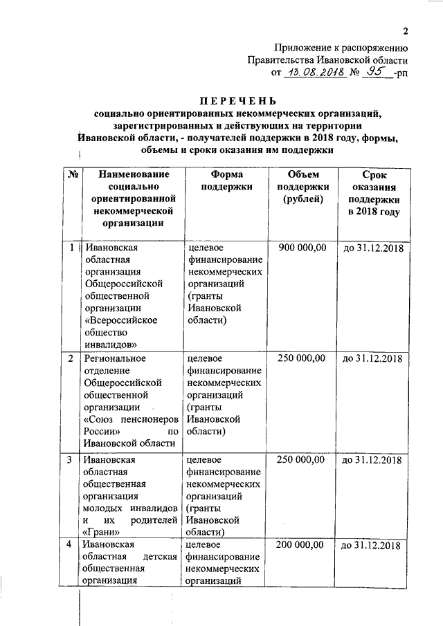 Распоряжение Правительства Ивановской области от 13.08.2018 N 95-рп "О формах, объемах и сроках оказания поддержки социально ориентированным некоммерческим организациям, зарегистрированным и действующим на территории Ивановской области, в 2018 году" (вместе с "Перечнем социально ориентированных некоммерческих организаций, зарегистрированных и действующих на территории Ивановской области, - получателей поддержки в 2018 году, формы, объемы и сроки оказания им поддержки")
