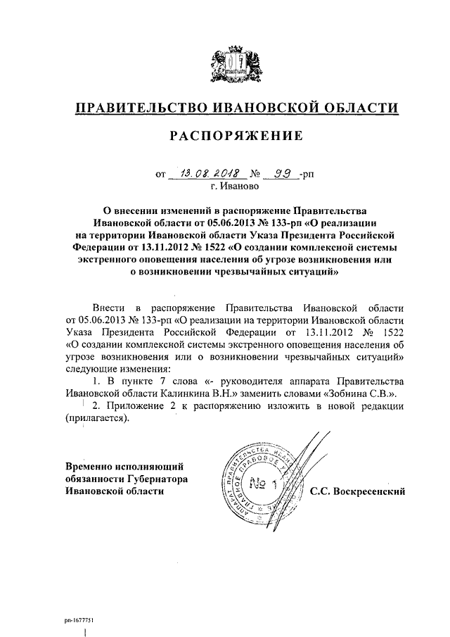 Распоряжение Правительства Ивановской области от 13.08.2018 N 99-рп "О внесении изменений в распоряжение Правительства Ивановской области от 05.06.2013 N 133-рп "О реализации на территории Ивановской области Указа Президента Российской Федерации от 13.11.2012 N 1522 "О создании комплексной системы экстренного оповещения населения об угрозе возникновения или о возникновении чрезвычайных ситуаций"