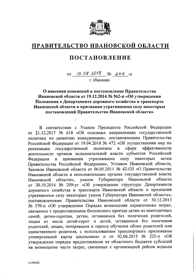 Постановление Правительства Ивановской области от 13.08.2018 N 244-п "О внесении изменений в постановление Правительства Ивановской области от 19.12.2014 N 562-п "Об утверждении Положения о Департаменте дорожного хозяйства и транспорта Ивановской области и признании утратившими силу некоторых постановлений Правительства Ивановской области"