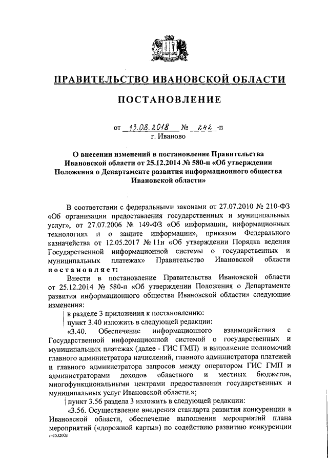 Постановление Правительства Ивановской области от 13.08.2018 N 242-п "О внесении изменений в постановление Правительства Ивановской области от 25.12.2014 N 580-п "Об утверждении Положения о Департаменте развития информационного общества Ивановской области"