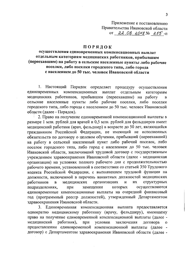 Постановление Правительства Ивановской области от 22.08.2018 N 255-п "Об осуществлении единовременных компенсационных выплат отдельным категориям медицинских работников, прибывшим (переехавшим) на работу в сельские населенные пункты, либо рабочие поселки, либо поселки городского типа, либо города с населением до 50 тыс. человек Ивановской области" (вместе с "Порядком осуществления единовременных компенсационных выплат отдельным категориям медицинских работников, прибывшим (переехавшим) на работу в сельские населенные пункты, либо рабочие поселки, либо поселки городского типа, либо города с населением до 50 тыс. человек Ивановской области")
