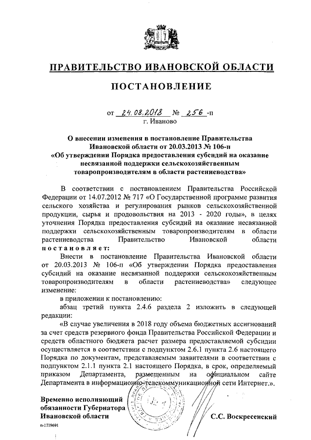 Постановление Правительства Ивановской области от 24.08.2018 N 256-п "О внесении изменения в постановление Правительства Ивановской области от 20.03.2013 N 106-п "Об утверждении Порядка предоставления субсидий на оказание несвязанной поддержки сельскохозяйственным товаропроизводителям в области растениеводства"