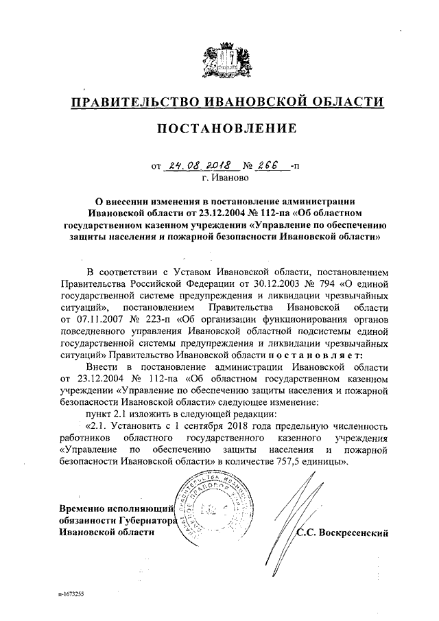 Постановление Правительства Ивановской области от 24.08.2018 N 266-п "О внесении изменения в постановление администрации Ивановской области от 23.12.2004 N 112-па "Об областном государственном казенном учреждении "Управление по обеспечению защиты населения и пожарной безопасности Ивановской области"
