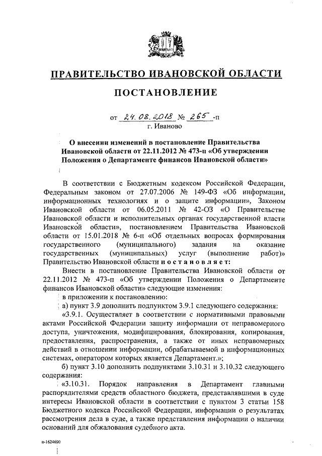 Постановление Правительства Ивановской области от 24.08.2018 N 265-п "О внесении изменений в постановление Правительства Ивановской области от 22.11.2012 N 473-п "Об утверждении Положения о Департаменте финансов Ивановской области"