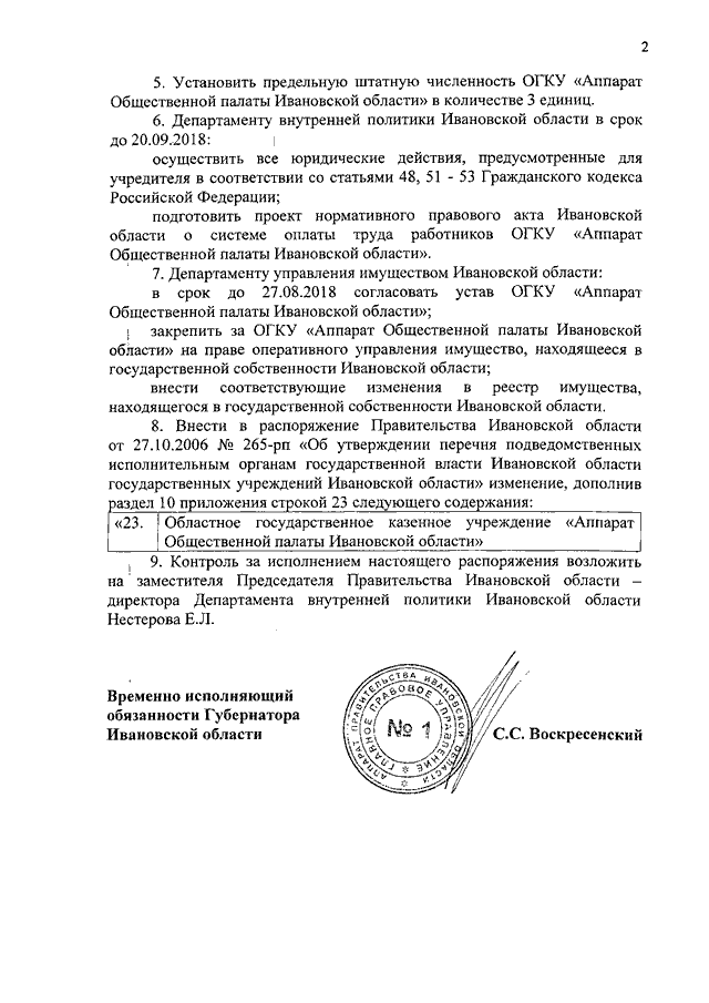 Распоряжение Правительства Ивановской области от 27.08.2018 N 103-рп "О создании областного государственного казенного учреждения "Аппарат Общественной палаты Ивановской области" и внесении изменения в распоряжение Правительства Ивановской области от 27.10.2006 N 265-рп "Об утверждении перечня подведомственных исполнительным органам государственной власти Ивановской области государственных учреждений Ивановской области"