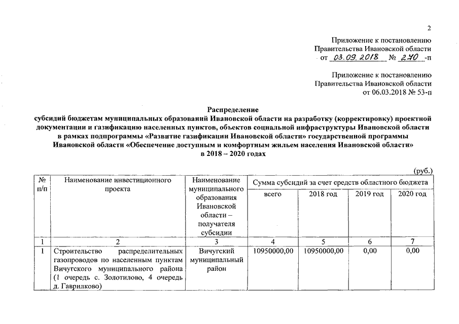 Постановление Правительства Ивановской области от 03.09.2018 N 270-п "О внесении изменения в постановление Правительства Ивановской области от 06.03.2018 N 53-п "О распределении субсидий бюджетам муниципальных образований Ивановской области на разработку (корректировку) проектной документации и газификацию населенных пунктов, объектов социальной инфраструктуры Ивановской области в рамках подпрограммы "Развитие газификации Ивановской области" государственной программы Ивановской области "Обеспечение доступным и комфортным жильем населения Ивановской области" в 2018 - 2020 годах"