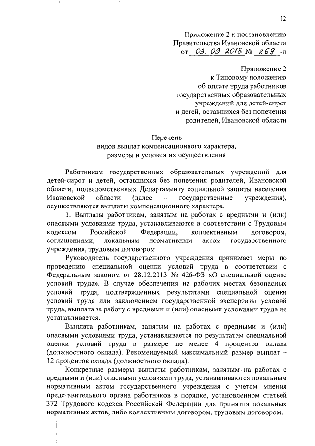 Постановление Правительства Ивановской области от 03.09.2018 N 269-п "О внесении изменений в постановление Правительства Ивановской области от 31.12.2008 N 366-п "О системе оплаты труда работников государственных учреждений системы социальной защиты населения Ивановской области" (вместе с "Перечнем видов выплат компенсационного характера, размерами и условиями их осуществления")