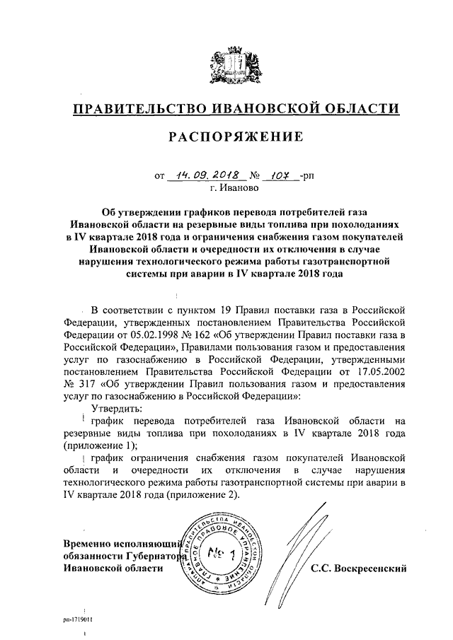 Распоряжение Правительства Ивановской области от 14.09.2018 N 107-рп "Об утверждении графиков перевода потребителей газа Ивановской области на резервные виды топлива при похолоданиях в IV квартале 2018 года и ограничения снабжения газом покупателей Ивановской области и очередности их отключения в случае нарушения технологического режима работы газотранспортной системы при аварии в IV квартале 2018 года"