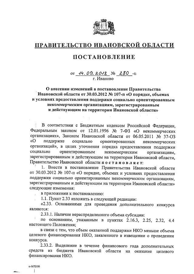 Постановление Правительства Ивановской области от 14.09.2018 N 280-п "О внесении изменений в постановление Правительства Ивановской области от 30.03.2012 N 107-п "О порядке, объемах и условиях предоставления поддержки социально ориентированным некоммерческим организациям, зарегистрированным и действующим на территории Ивановской области"