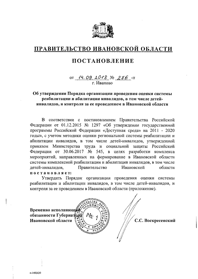 Постановление Правительства Ивановской области от 14.09.2018 N 276-п "Об утверждении Порядка организации проведения оценки системы реабилитации и абилитации инвалидов, в том числе детей-инвалидов, и контроля за ее проведением в Ивановской области"