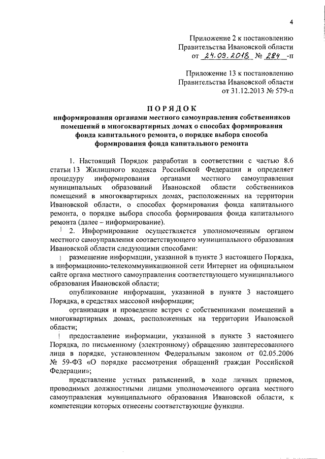 Постановление Правительства Ивановской области от 24.09.2018 N 284-п "О внесении изменений в постановление Правительства Ивановской области от 31.12.2013 N 579-п "Об утверждении порядков, регулирующих отношения в сфере обеспечения проведения капитального ремонта общего имущества в многоквартирных домах, расположенных на территории Ивановской области" (вместе с "Порядком информирования собственников помещений в многоквартирных домах и организаций, осуществляющих управление многоквартирными домами, о содержании региональной программы капитального ремонта общего имущества в многоквартирных домах и критериях оценки состояния многоквартирных домов, на основании которых определяется очередность проведения капитального ремонта", "Порядком информирования органами местного самоуправления собственников помещений в многоквартирных домах о способах формирования фонда капитального ремонта, о порядке выбора способа формирования фонда капитального ремонта")