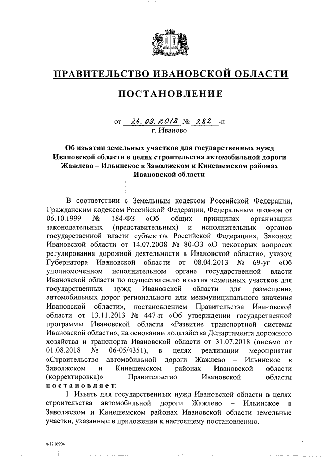 Постановление Правительства Ивановской области от 24.09.2018 N 282-п "Об изъятии земельных участков для государственных нужд Ивановской области в целях строительства автомобильной дороги Жажлево - Ильинское в Заволжском и Кинешемском районах Ивановской области"