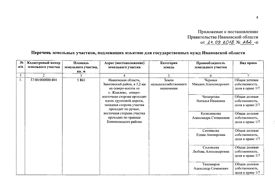 Постановление Правительства Ивановской области от 24.09.2018 N 282-п "Об изъятии земельных участков для государственных нужд Ивановской области в целях строительства автомобильной дороги Жажлево - Ильинское в Заволжском и Кинешемском районах Ивановской области"