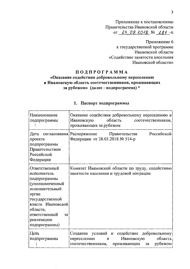 Постановление Правительства Ивановской области от 24.09.2018 N 281-п "О внесении изменений в постановление Правительства Ивановской области от 09.07.2013 N 279-п "Об утверждении государственной программы Ивановской области "Содействие занятости населения Ивановской области" (вместе с "Подпрограммой "Оказание содействия добровольному переселению в Ивановскую область соотечественников, проживающих за рубежом")