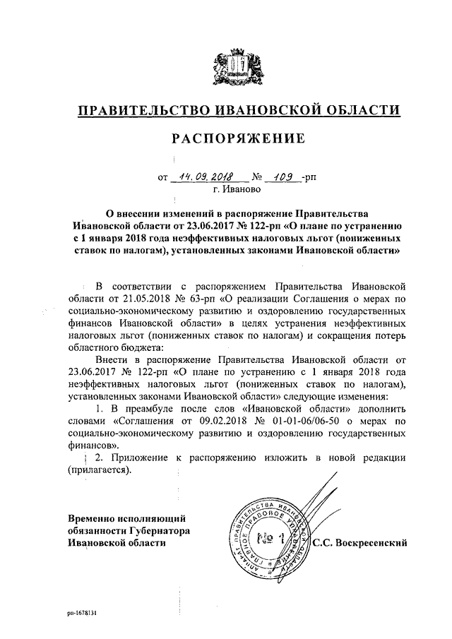 Распоряжение Правительства Ивановской области от 14.09.2018 N 109-рп "О внесении изменений в распоряжение Правительства Ивановской области от 23.06.2017 N 122-рп "О плане по устранению с 1 января 2018 года неэффективных налоговых льгот (пониженных ставок по налогам), установленных законами Ивановской области"