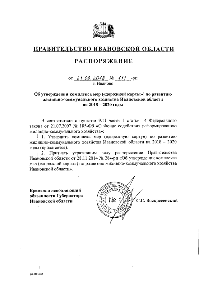 Распоряжение Правительства Ивановской области от 21.09.2018 N 111-рп "Об утверждении комплекса мер ("дорожной карты") по развитию жилищно-коммунального хозяйства Ивановской области на 2018 - 2020 годы"