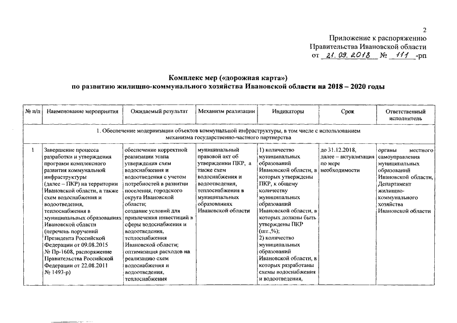 Распоряжение Правительства Ивановской области от 21.09.2018 N 111-рп "Об утверждении комплекса мер ("дорожной карты") по развитию жилищно-коммунального хозяйства Ивановской области на 2018 - 2020 годы"