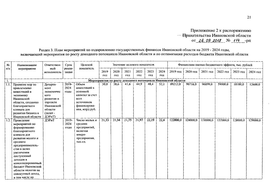 Распоряжение Правительства Ивановской области от 26.09.2018 N 114-рп "О внесении изменений в распоряжение Правительства Ивановской области от 19.02.2014 N 27-рп "О плане мероприятий по росту доходов, оптимизации расходов и совершенствованию долговой политики Ивановской области на 2014 - 2019 годы"