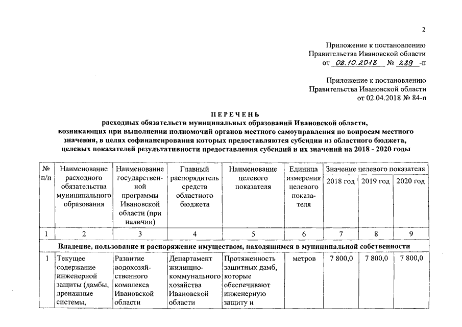 Постановление Правительства Ивановской области от 08.10.2018 N 289-п "О внесении изменений в постановление Правительства Ивановской области от 02.04.2018 N 84-п "Об утверждении перечня расходных обязательств муниципальных образований Ивановской области, возникающих при выполнении полномочий органов местного самоуправления по вопросам местного значения, в целях софинансирования которых предоставляются субсидии из областного бюджета, целевых показателей результативности предоставления субсидий и их значений на 2018 - 2020 годы"