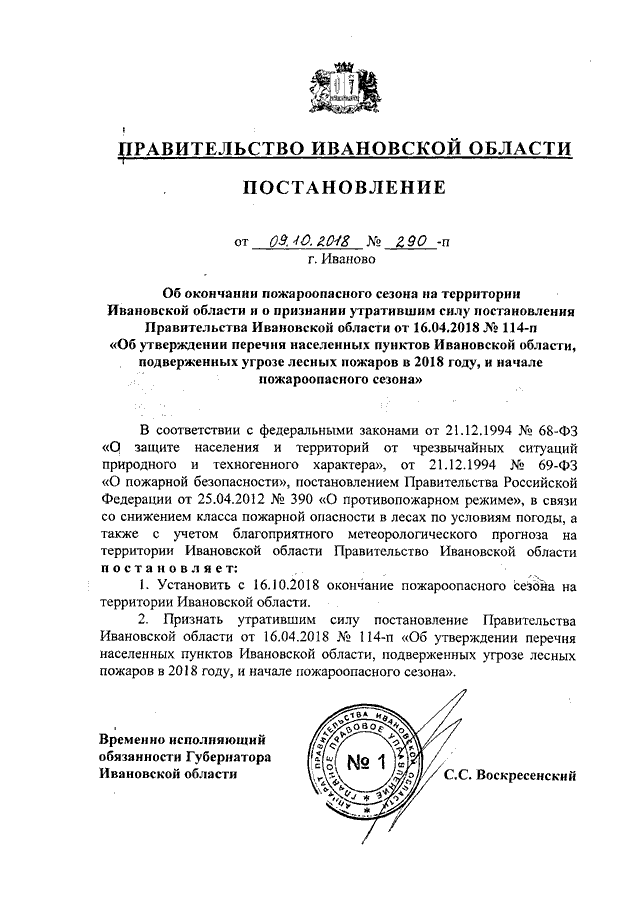Постановление Правительства Ивановской области от 09.10.2018 N 290-п "Об окончании пожароопасного сезона на территории Ивановской области и о признании утратившим силу постановления Правительства Ивановской области от 16.04.2018 N 114-п "Об утверждении перечня населенных пунктов Ивановской области, подверженных угрозе лесных пожаров в 2018 году, и начале пожароопасного сезона"