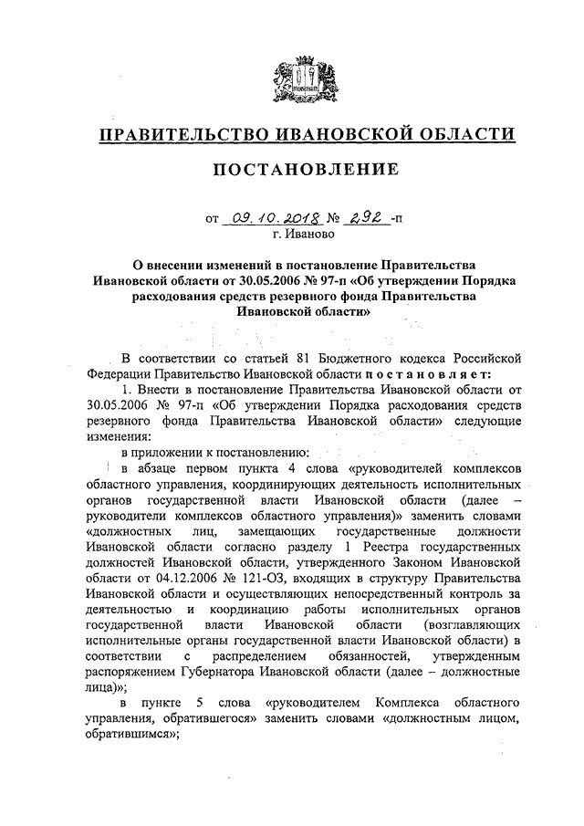 Постановление Правительства Ивановской области от 09.10.2018 N 292-п "О внесении изменений в постановление Правительства Ивановской области от 30.05.2006 N 97-п "Об утверждении Порядка расходования средств резервного фонда Правительства Ивановской области"