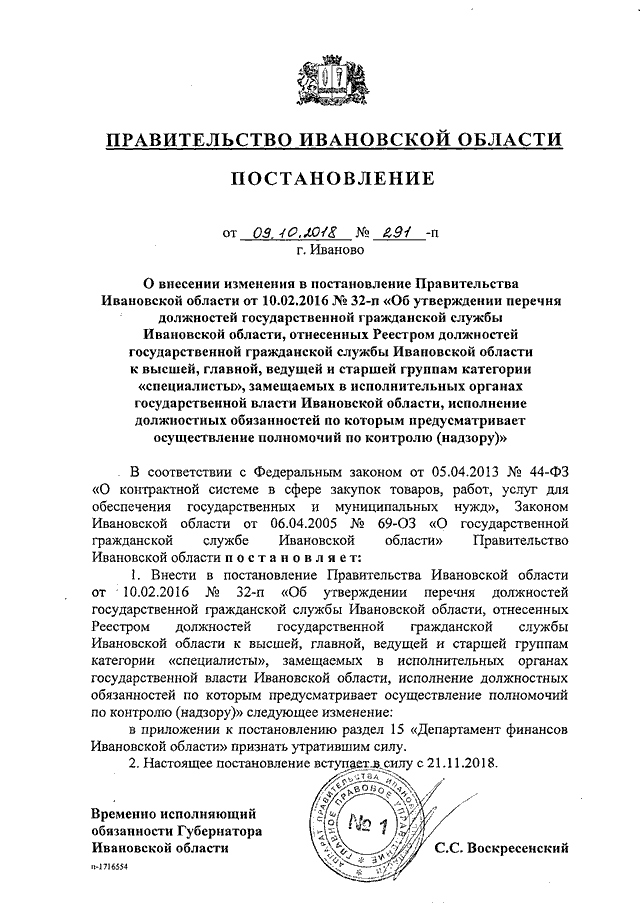 Постановление Правительства Ивановской области от 09.10.2018 N 291-п "О внесении изменения в постановление Правительства Ивановской области от 10.02.2016 N 32-п "Об утверждении перечня должностей государственной гражданской службы Ивановской области, отнесенных Реестром должностей государственной гражданской службы Ивановской области к высшей, главной, ведущей и старшей группам категории "специалисты", замещаемых в исполнительных органах государственной власти Ивановской области, исполнение должностных обязанностей по которым предусматривает осуществление полномочий по контролю (надзору)"