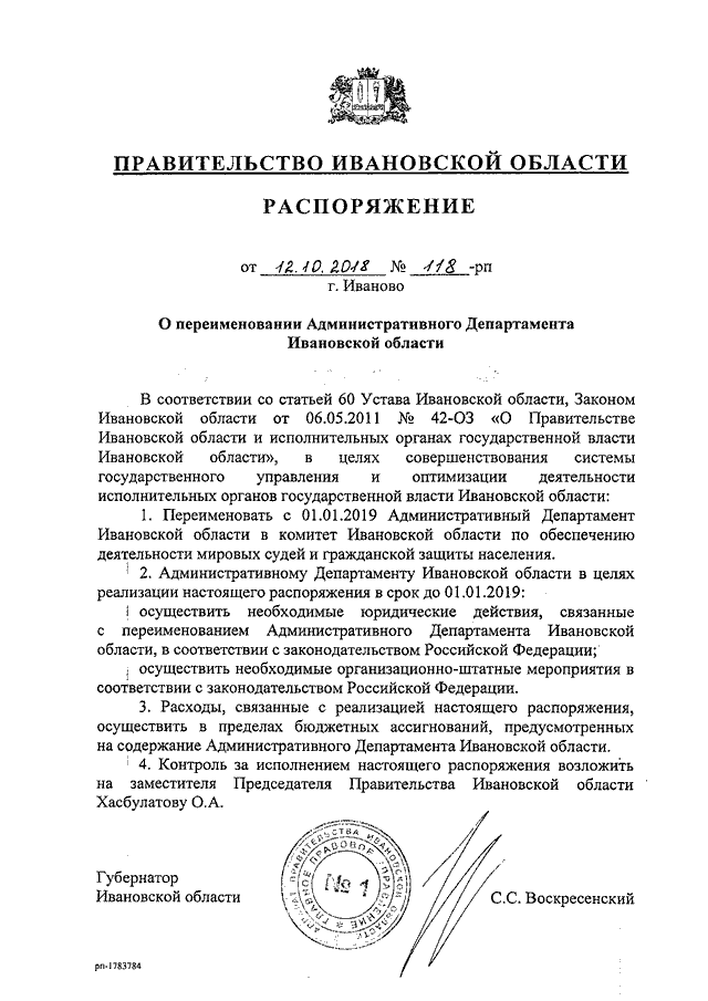 Распоряжение Правительства Ивановской области от 12.10.2018 N 118-рп "О переименовании Административного Департамента Ивановской области"