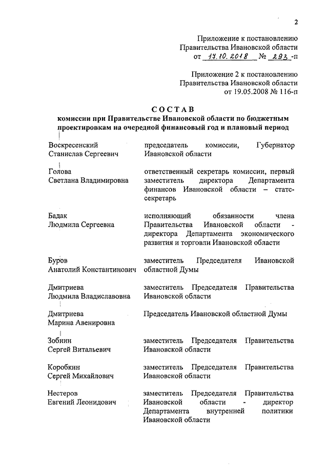 Постановление Правительства Ивановской области от 17.10.2018 N 293-п "О внесении изменения в постановление Правительства Ивановской области от 19.05.2008 N 116-п "О комиссии при Правительстве Ивановской области по бюджетным проектировкам на очередной финансовый год и плановый период"