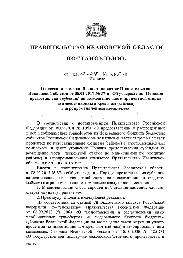 Постановление Правительства Ивановской области от 23.10.2018 N 295-п "О внесении изменений в постановление Правительства Ивановской области от 08.02.2017 N 37-п "Об утверждении Порядка предоставления субсидий на возмещение части процентной ставки по инвестиционным кредитам (займам) в агропромышленном комплексе"