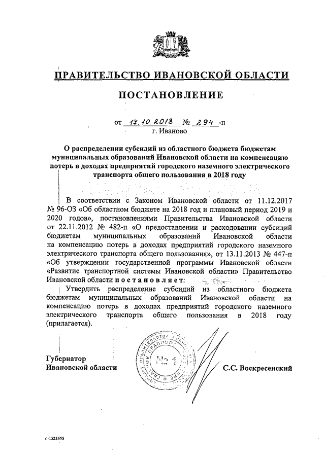 Постановление Правительства Ивановской области от 17.10.2018 N 294-п "О распределении субсидий из областного бюджета бюджетам муниципальных образований Ивановской области на компенсацию потерь в доходах предприятий городского наземного электрического транспорта общего пользования в 2018 году"