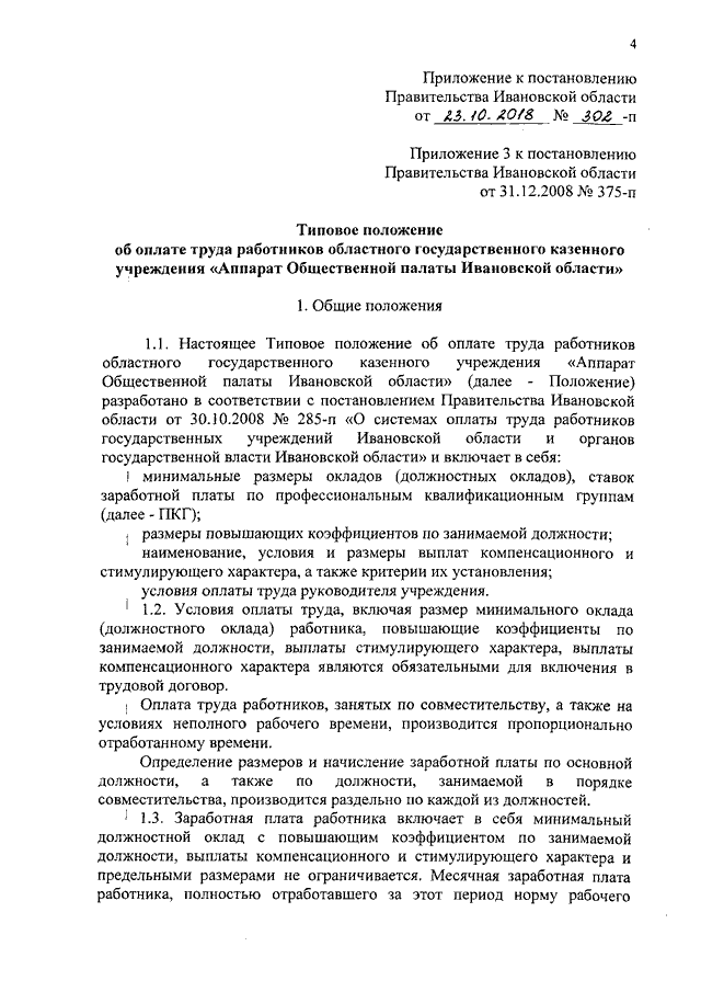 Постановление Правительства Ивановской области от 23.10.2018 N 302-п "О внесении изменений в постановление Правительства Ивановской области от 31.12.2008 N 375-п "О системе оплаты труда работников государственных учреждений Ивановской области, подведомственных Департаменту внутренней политики Ивановской области" (вместе с "Типовым положением об оплате труда работников областного государственного казенного учреждения "Аппарат Общественной палаты Ивановской области")