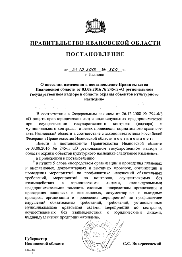 Постановление Правительства Ивановской области от 23.10.2018 N 300-п "О внесении изменения в постановление Правительства Ивановской области от 03.08.2016 N 245-п "О региональном государственном надзоре в области охраны объектов культурного наследия"