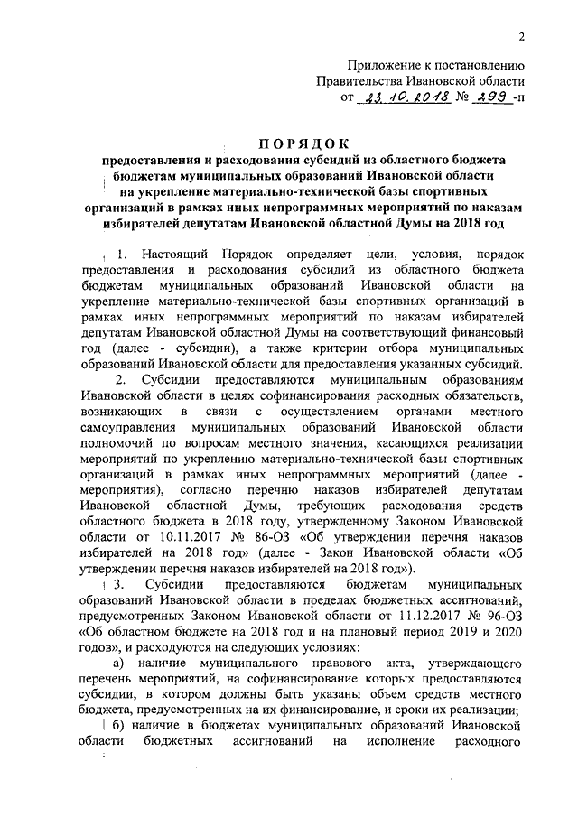 Постановление Правительства Ивановской области от 23.10.2018 N 299-п "Об утверждении Порядка предоставления и расходования субсидий из областного бюджета бюджетам муниципальных образований Ивановской области на укрепление материально-технической базы спортивных организаций в рамках иных непрограммных мероприятий по наказам избирателей депутатам Ивановской областной Думы на 2018 год"