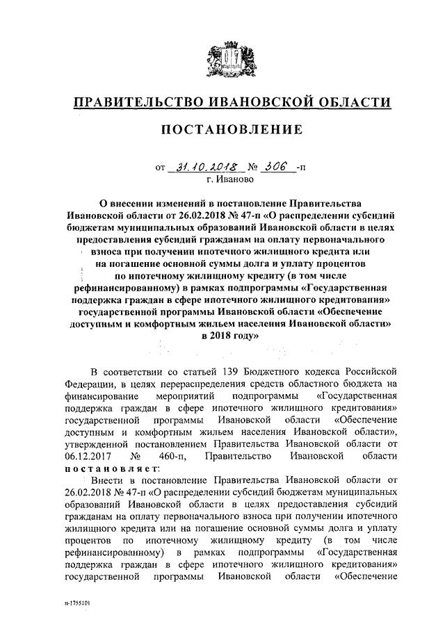 Постановление Правительства Ивановской области от 31.10.2018 N 306-п "О внесении изменений в постановление Правительства Ивановской области от 26.02.2018 N 47-п "О распределении субсидий бюджетам муниципальных образований Ивановской области в целях предоставления субсидий гражданам на оплату первоначального взноса при получении ипотечного жилищного кредита или на погашение основной суммы долга и уплату процентов по ипотечному жилищному кредиту (в том числе рефинансированному) в рамках подпрограммы "Государственная поддержка граждан в сфере ипотечного жилищного кредитования" государственной программы Ивановской области "Обеспечение доступным и комфортным жильем населения Ивановской области" в 2018 году"