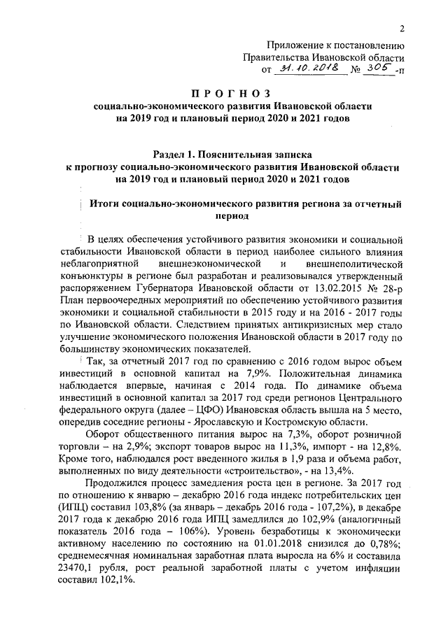 Постановление Правительства Ивановской области от 31.10.2018 N 305-п "О прогнозе социально-экономического развития Ивановской области на 2019 год и плановый период 2020 и 2021 годов"
