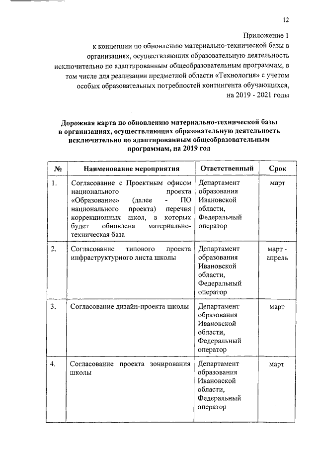 Распоряжение Правительства Ивановской области от 31.10.2018 N 125-рп "Об утверждении комплекса мер и концепции по обновлению материально-технической базы в организациях, осуществляющих образовательную деятельность исключительно по адаптированным общеобразовательным программам, на 2019 - 2021 годы" (вместе с "Концепцией по обновлению материально-технической базы в организациях, осуществляющих образовательную деятельность исключительно по адаптированным общеобразовательным программам, в том числе для реализации предметной области "Технология" с учетом особых образовательных потребностей контингента обучающихся, на 2019 - 2021 годы")