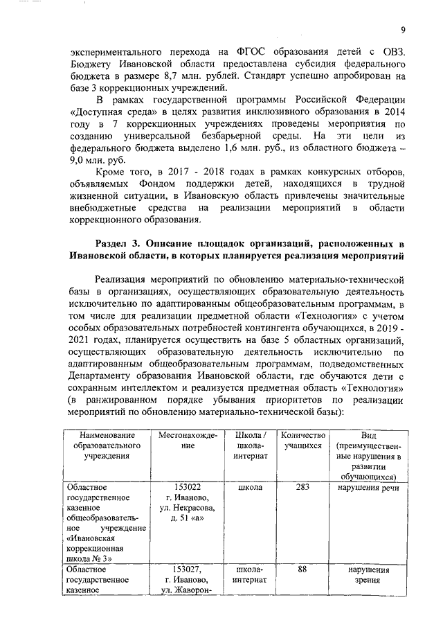 Распоряжение Правительства Ивановской области от 31.10.2018 N 125-рп "Об утверждении комплекса мер и концепции по обновлению материально-технической базы в организациях, осуществляющих образовательную деятельность исключительно по адаптированным общеобразовательным программам, на 2019 - 2021 годы" (вместе с "Концепцией по обновлению материально-технической базы в организациях, осуществляющих образовательную деятельность исключительно по адаптированным общеобразовательным программам, в том числе для реализации предметной области "Технология" с учетом особых образовательных потребностей контингента обучающихся, на 2019 - 2021 годы")