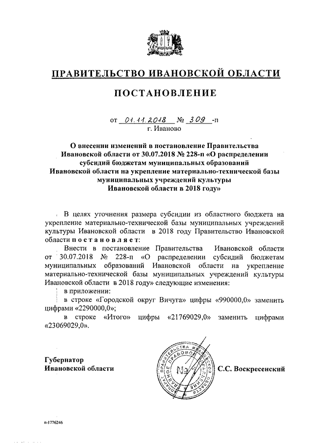 Постановление Правительства Ивановской области от 01.11.2018 N 309-п "О внесении изменений в постановление Правительства Ивановской области от 30.07.2018 N 228-п "О распределении субсидий бюджетам муниципальных образований Ивановской области на укрепление материально-технической базы муниципальных учреждений культуры Ивановской области в 2018 году"