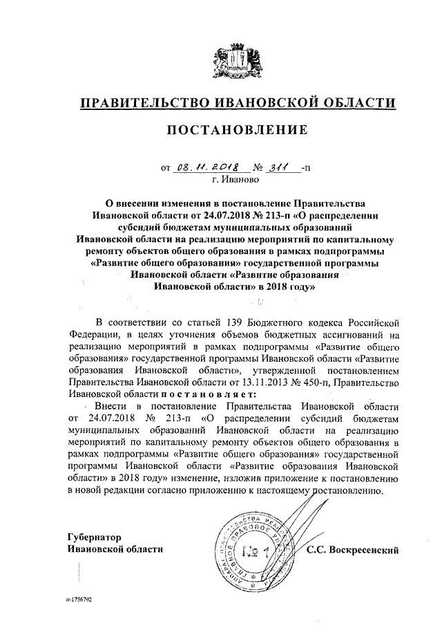 Постановление Правительства Ивановской области от 08.11.2018 N 311-п "О внесении изменения в постановление Правительства Ивановской области от 24.07.2018 N 213-п "О распределении субсидий бюджетам муниципальных образований Ивановской области на реализацию мероприятий по капитальному ремонту объектов общего образования в рамках подпрограммы "Развитие общего образования" государственной программы Ивановской области "Развитие образования Ивановской области" в 2018 году"