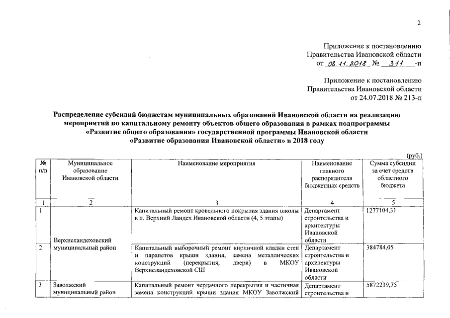 Постановление Правительства Ивановской области от 08.11.2018 N 311-п "О внесении изменения в постановление Правительства Ивановской области от 24.07.2018 N 213-п "О распределении субсидий бюджетам муниципальных образований Ивановской области на реализацию мероприятий по капитальному ремонту объектов общего образования в рамках подпрограммы "Развитие общего образования" государственной программы Ивановской области "Развитие образования Ивановской области" в 2018 году"