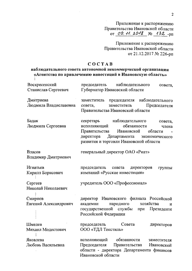 Распоряжение Правительства Ивановской области от 09.11.2018 N 132-рп "О внесении изменения в распоряжение Правительства Ивановской области от 21.12.2017 N 226-рп "О создании наблюдательного совета автономной некоммерческой организации "Агентство по привлечению инвестиций в Ивановскую область"