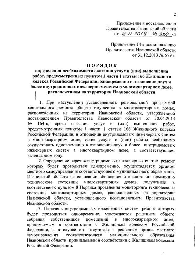 Постановление Правительства Ивановской области от 12.11.2018 N 320-п "О внесении изменений в постановление Правительства Ивановской области от 31.12.2013 N 579-п "Об утверждении порядков, регулирующих отношения в сфере обеспечения проведения капитального ремонта общего имущества в многоквартирных домах, расположенных на территории Ивановской области" (вместе с "Порядком определения необходимости оказания услуг и (или) выполнения работ, предусмотренных пунктом 1 части 1 статьи 166 Жилищного кодекса Российской Федерации, одновременно в отношении двух и более внутридомовых инженерных систем в многоквартирном доме, расположенном на территории Ивановской области")