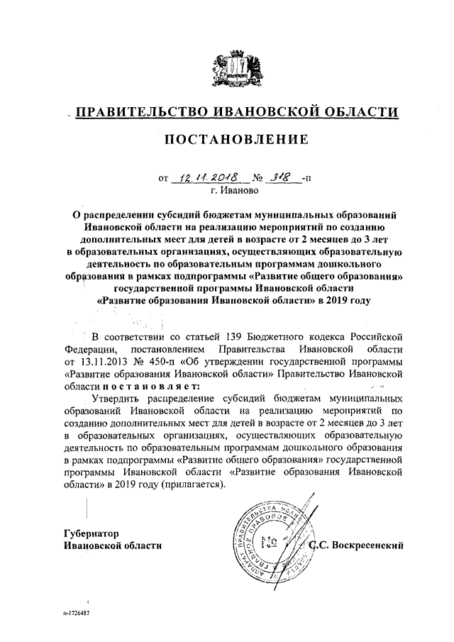 Постановление Правительства Ивановской области от 12.11.2018 N 318-п "О распределении субсидий бюджетам муниципальных образований Ивановской области на реализацию мероприятий по созданию дополнительных мест для детей в возрасте от 2 месяцев до 3 лет в образовательных организациях, осуществляющих образовательную деятельность по образовательным программам дошкольного образования в рамках подпрограммы "Развитие общего образования" государственной программы Ивановской области "Развитие образования Ивановской области" в 2019 году"